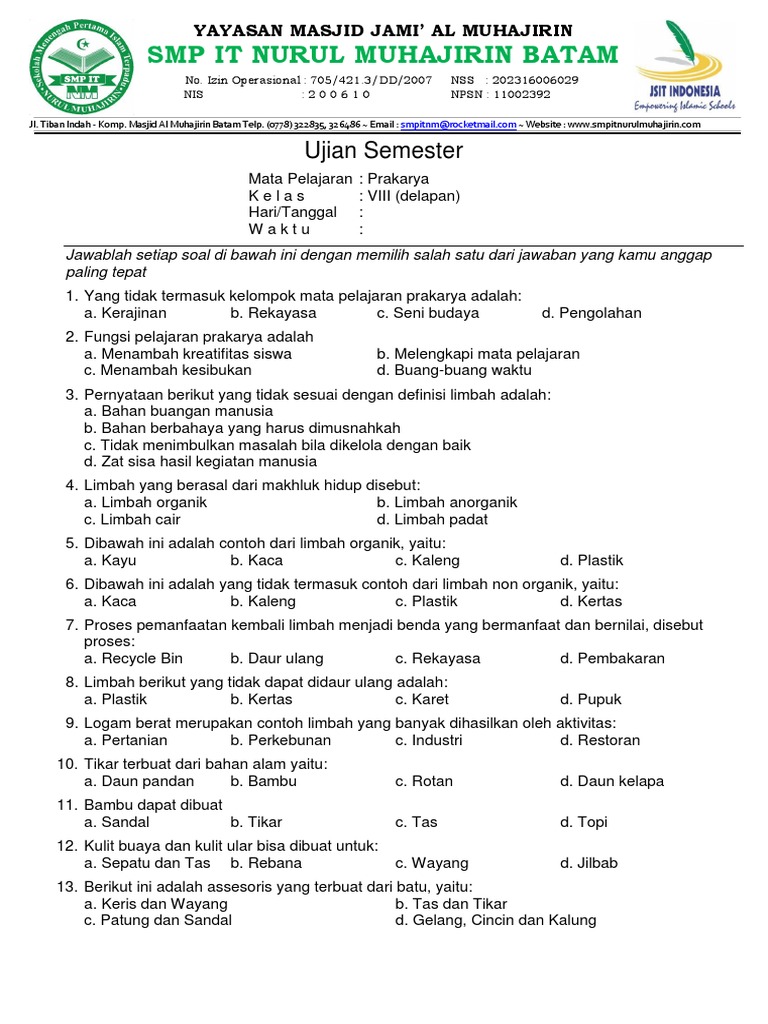 Tulis namamu di sudut kanan atas 2. Sebagaimana yang kita ketahui bersama bahwa. Kali ini cara sunda akan memposting soal latihan pts prakarya semester 2 smp/mts. Semoga soal uas prakarya kelas 7 semester 2 dan kunci jawaban ini. Soal prakarya kelas 7 semester 2 pilihan ganda beserta jawabannya, kisi kisi soal pas bahasa inggris kelas vii kurikulum 2019 sumber :